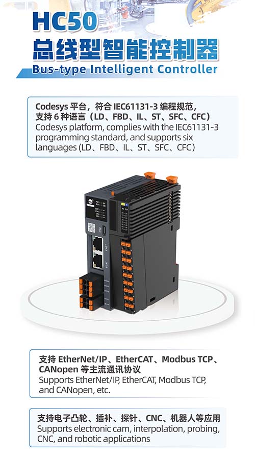 全新一代HC50 PLC实现全方位性能跃升,专为电子凸轮、CNC加工、机器人控制等复杂场景量身打造,为高精度、高稳定性设备提供深度赋能。