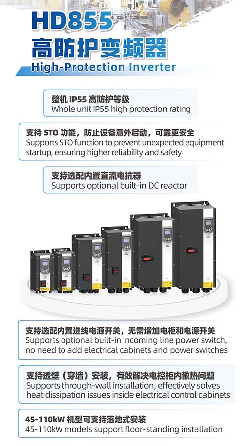 新一代HD855高防护变频器凭借整机IP55防护等级,可有效抵御粉尘、水汽侵袭,精准适配陶瓷、矿山、港口等恶劣工况场景,保障设备稳定运行