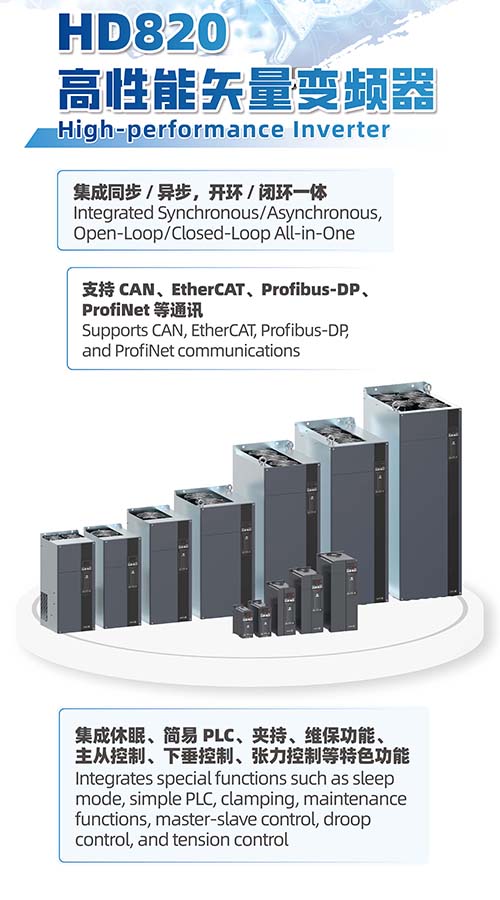 新一代HD820高性能矢量变频器以“超强兼容、超高集成”为核心亮点,精准覆盖印刷包装、机床加工、纺织印染等多行业应用场景,提供高效适配的传动解决方案。