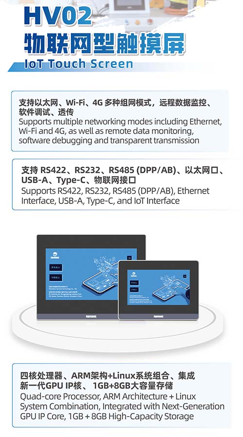 全新一代HV02物联网型触摸屏聚焦全场景物联交互与远程管控需求,打造成为工业设备物联网化升级的交互中枢。